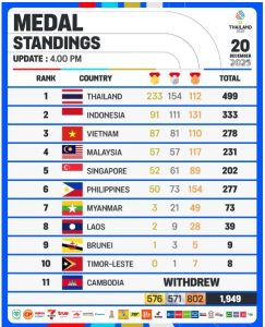 Thailand menutup kompetisi dengan performa yang sulit tertandingi. Mengoleksi total 233 medali emas, 154 perak, dan 112 perunggu, tuan rumah mengamankan gelar “King of Gold Medals” untuk ke-14 kalinya sepanjang sejarah.